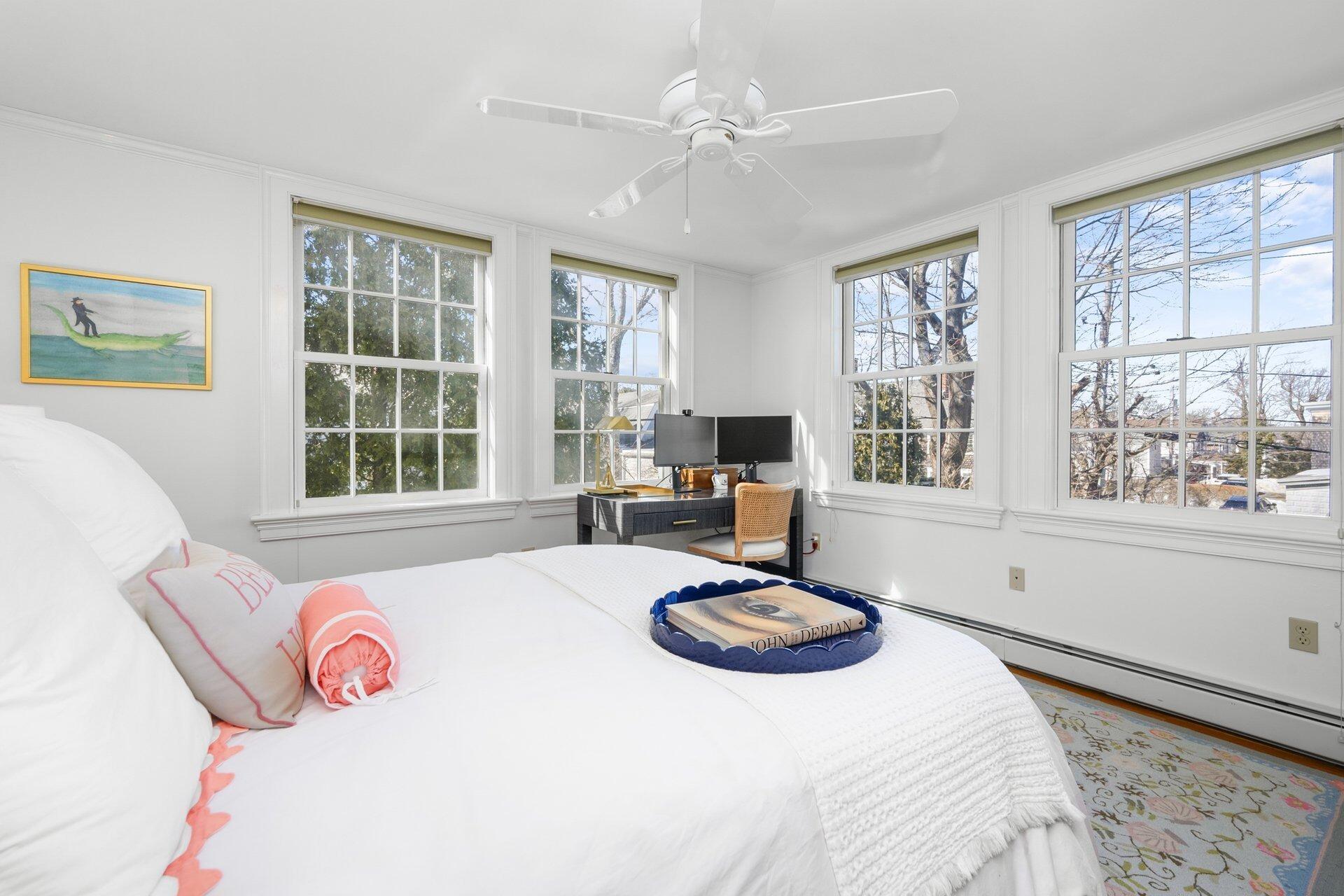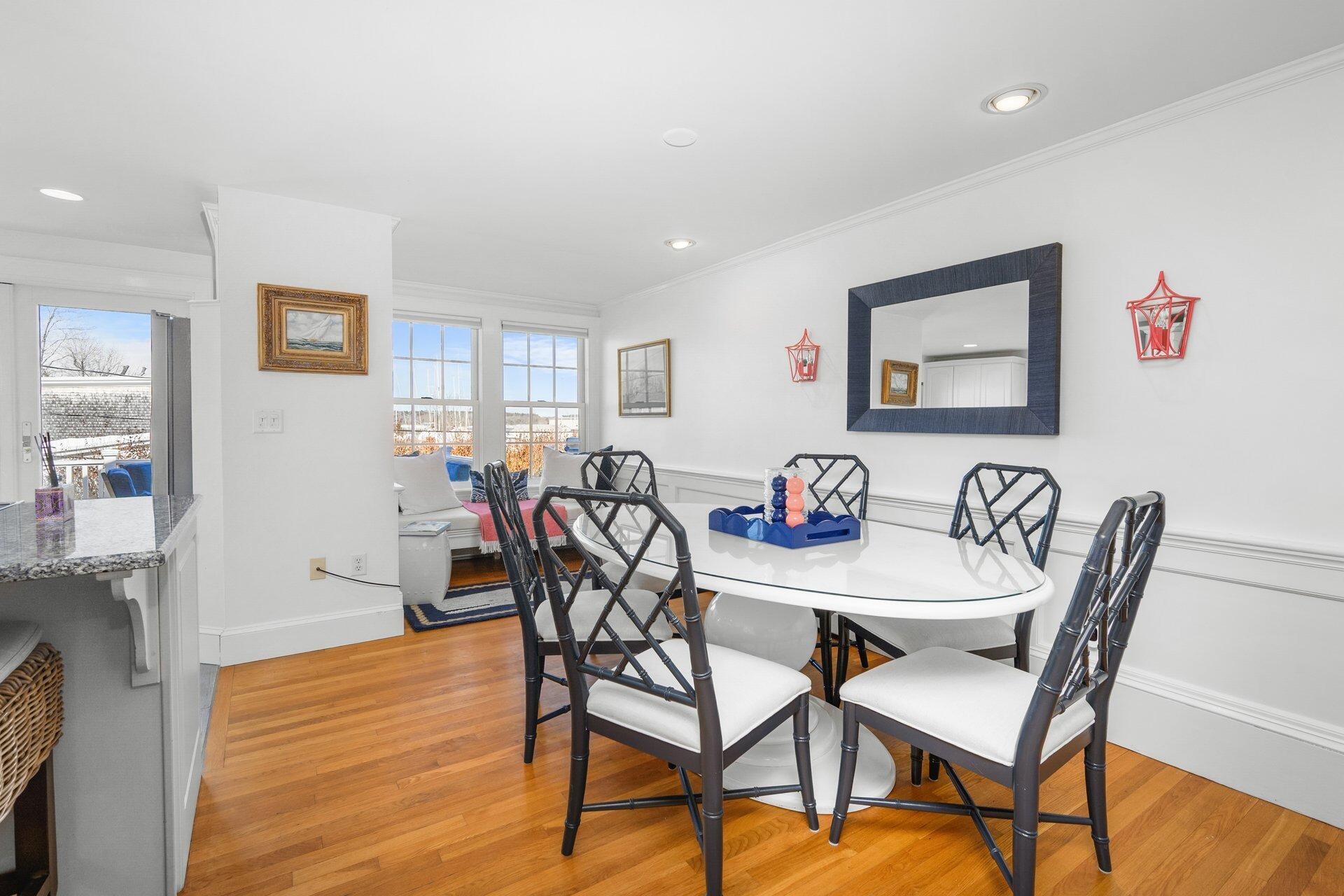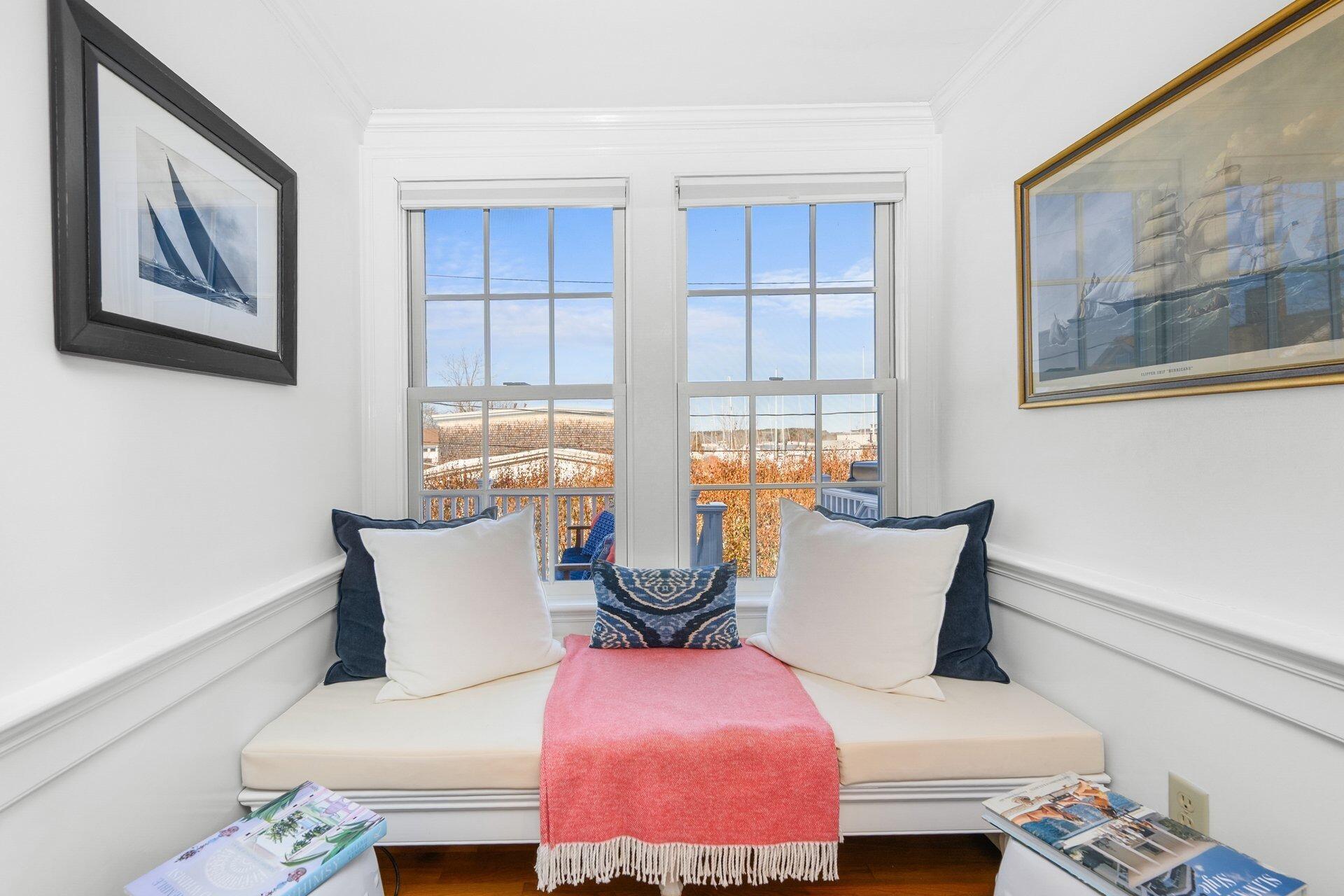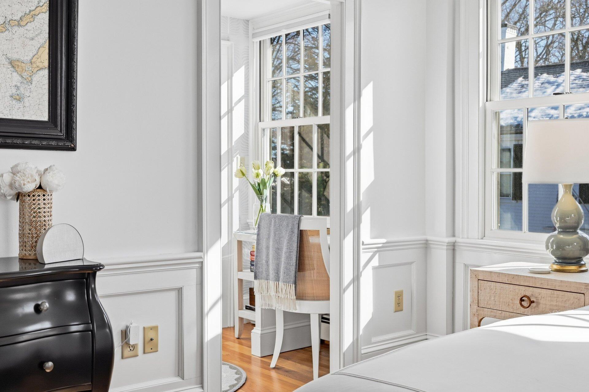 Discover the best of classic New England architecture and coastal luxury at this thoughtfully updated condo in the heart of Marion Village. The entry, distinguished by a charming transom window, opens to a light-filled interior with hardwood floors and crisp wainscoting. The living room is anchored by a fireplace and a built-in window seat capturing views of Sippican Harbor. French doors lead to an elevated outdoor deck overlooking the harbor, ideal for seasonal entertaining. The kitchen features granite countertops, white cabinetry, and stainless-steel appliances, adjacent to a dining area with a built-in china cabinet. The primary suite serves as a private sanctuary and includes a fireplace, office nook, and en suite bath with a soaking tub and glass shower. Ready to be enjoyed, this home is perfectly positioned within a short walk of the Beverly Yacht Club, the General Store, the Sippican Tennis Club, Silvershell Beach and everything the village has to offer.