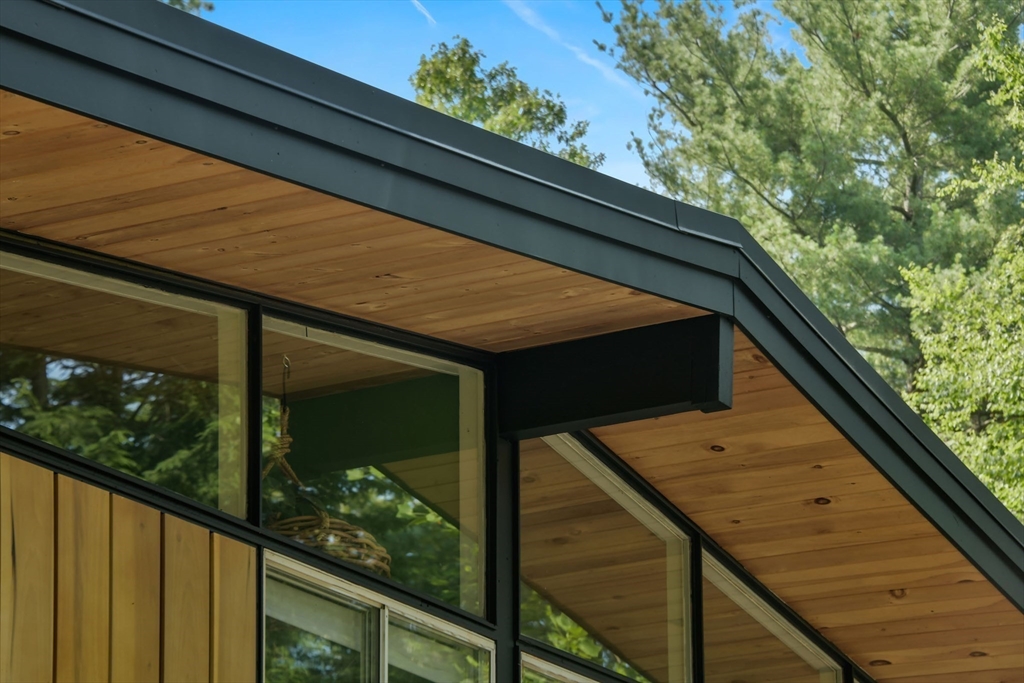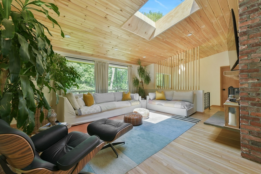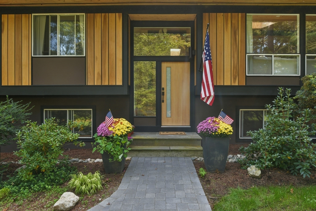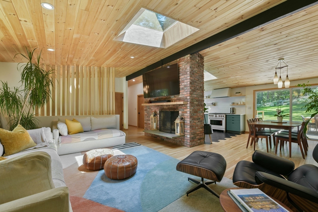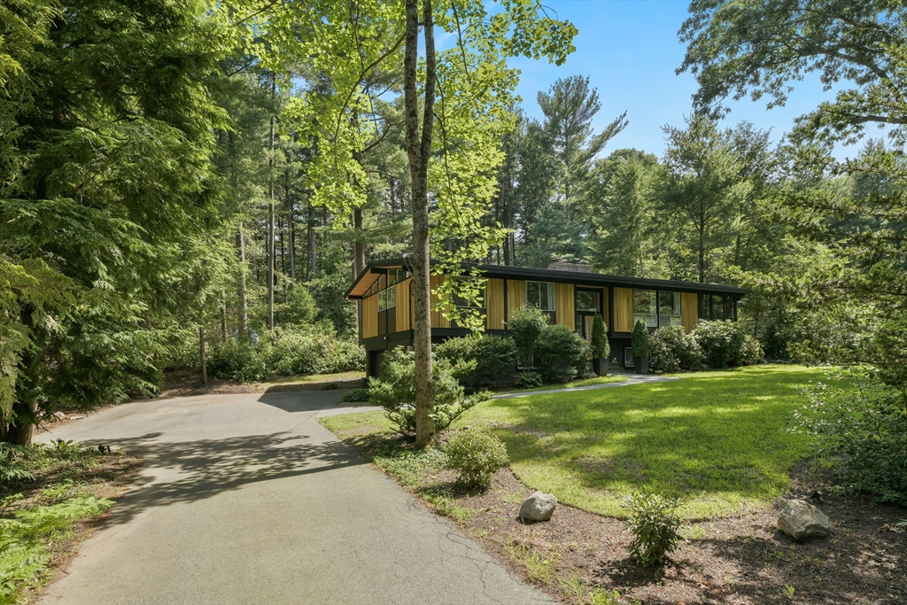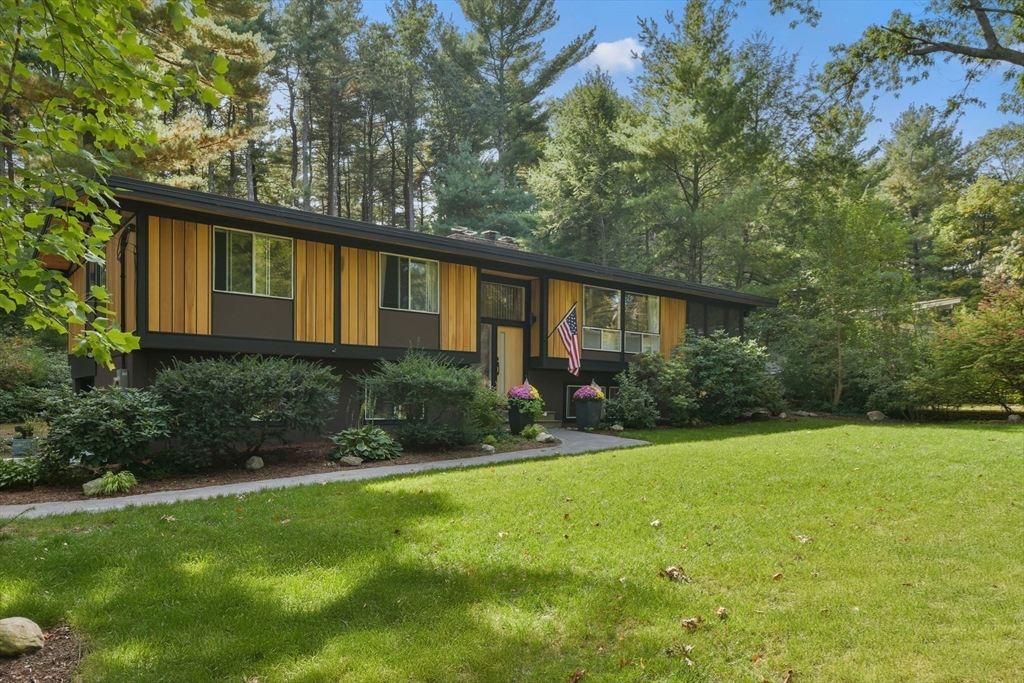 Nestled in Wayland's most coveted neighborhood, this meticulously reimagined midcentury modern home offers a unique living experience with clean lines and abundant natural light. Spanning approximately 2,000 sq ft., this 3-bedroom, 2.5-bathroom residence perfectly blends modern sophistication with midcentury charm. The heart of this home is an open-concept living space, anchored by a stylish, functional kitchen designed to seamlessly integrate with living and dining areas. Soaring ceilings with exposed beams and expansive skylights create a bright and airy ambiance, inviting relaxation and connection. Step outside to an expansive yard that offers warmth, charm, and effortless style. Enjoy direct access to trails behind the yard, perfect for leisurely strolls or embracing nature. Embrace the tranquility of a top-rated school district and a welcoming community atmosphere. This exceptional residence is more than just a house, it's a lifestyle offering comfort without sacrificing modernity