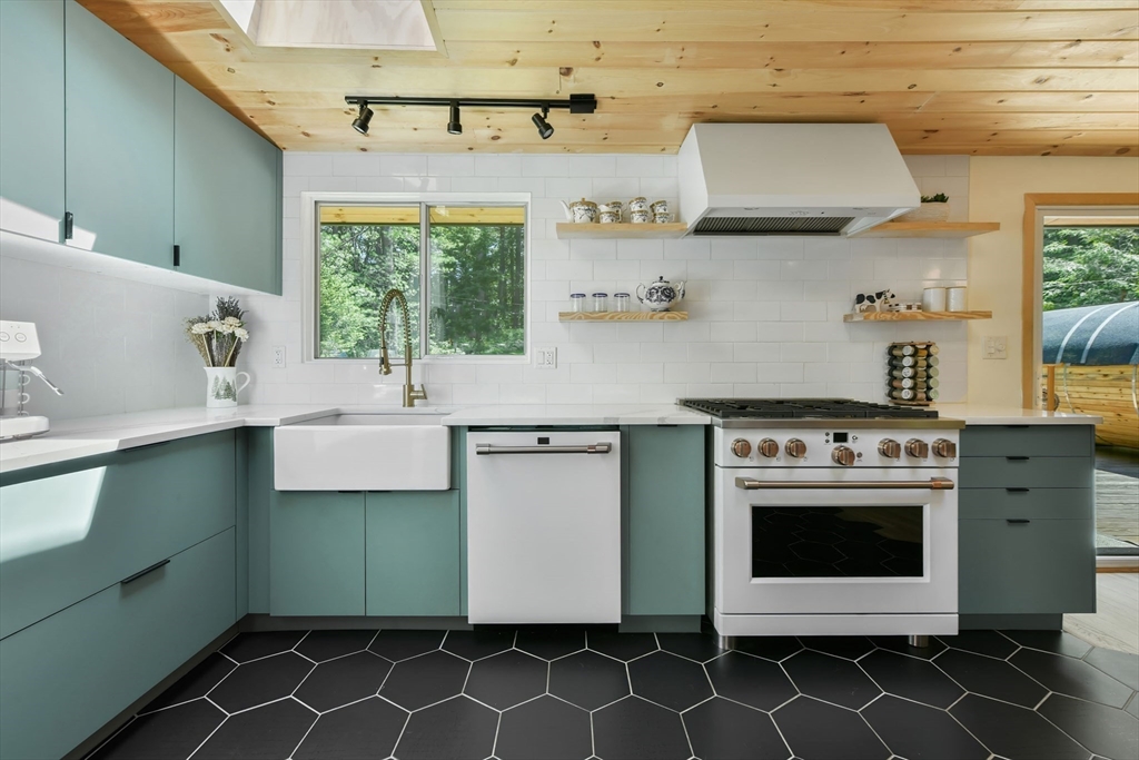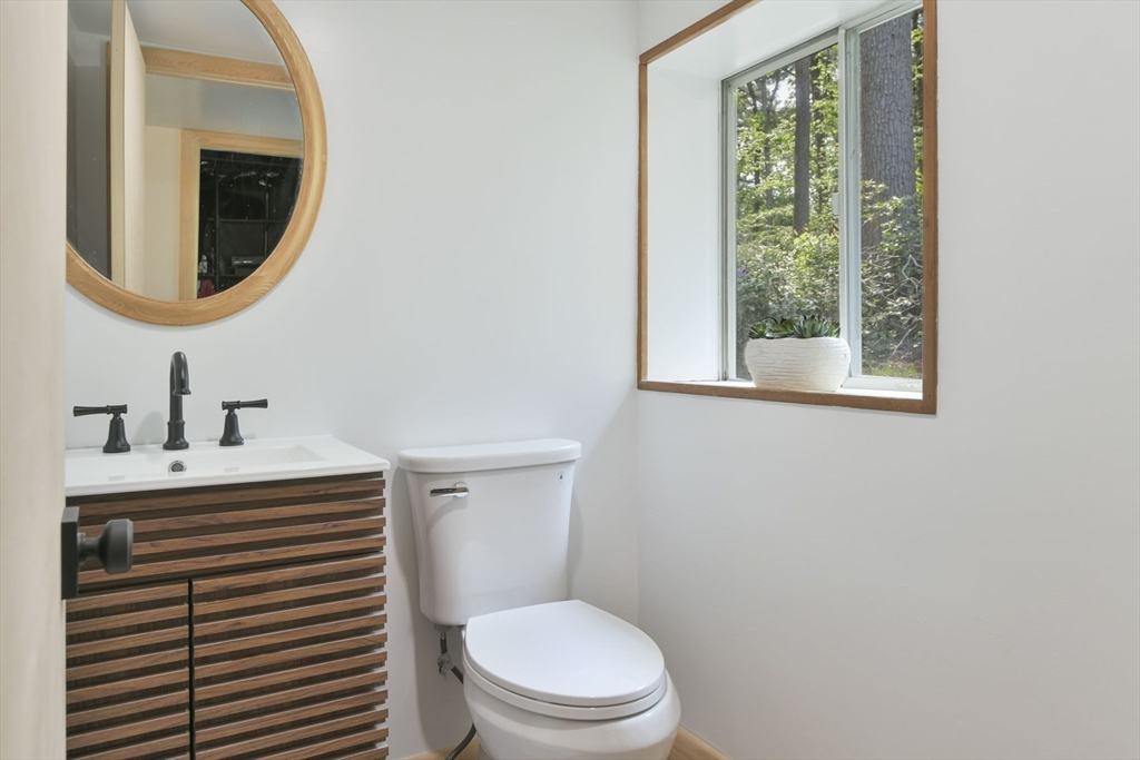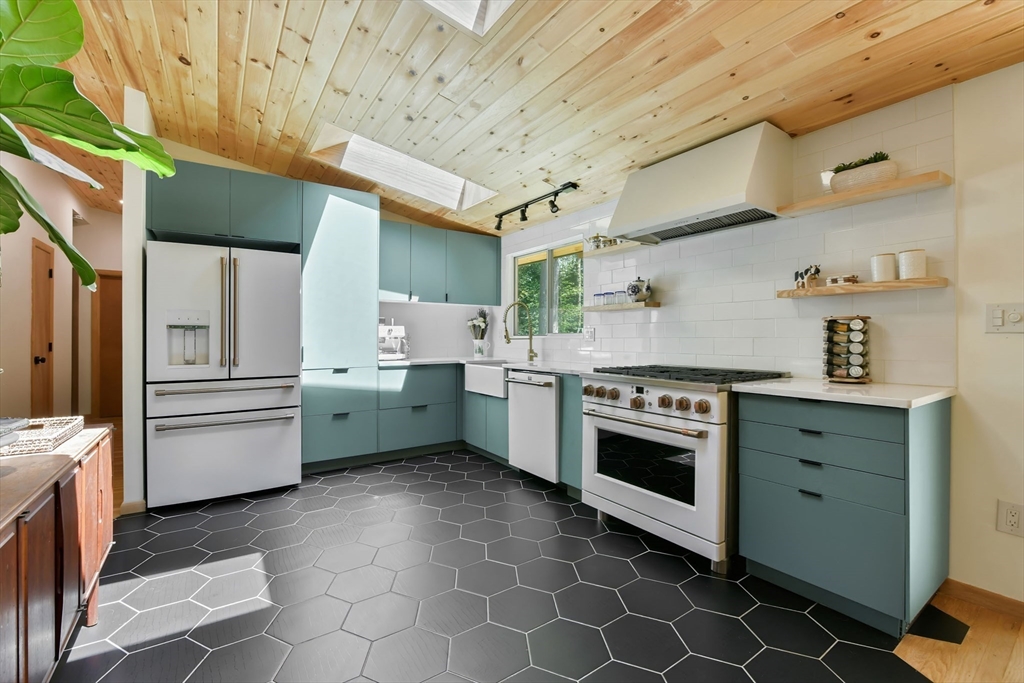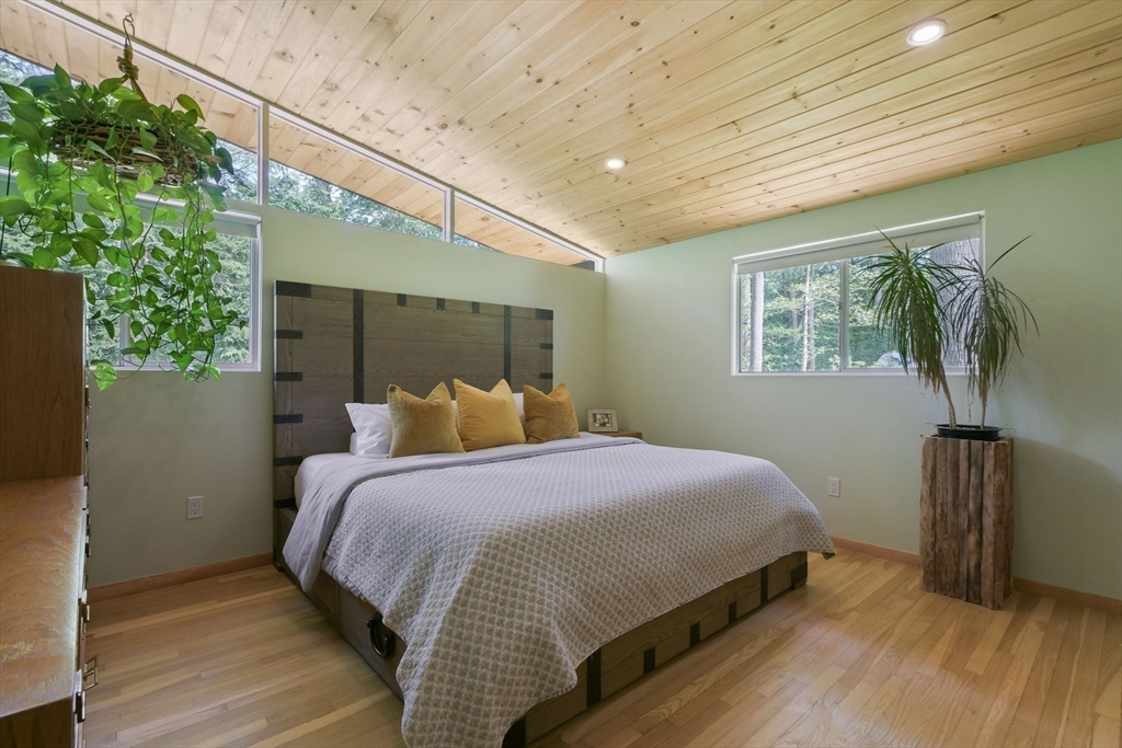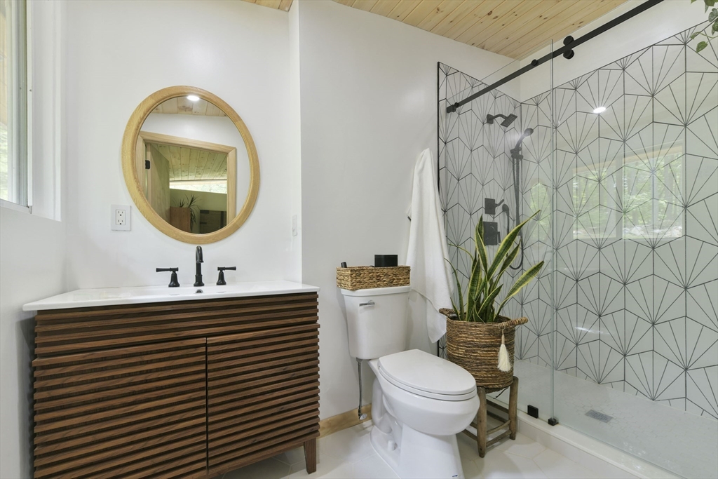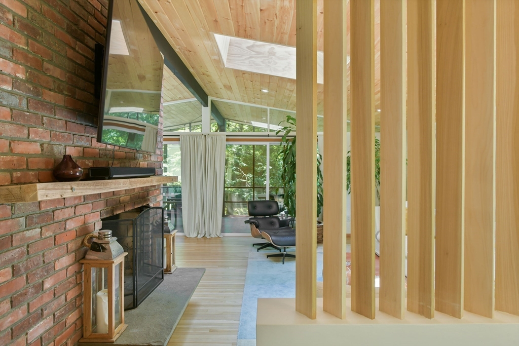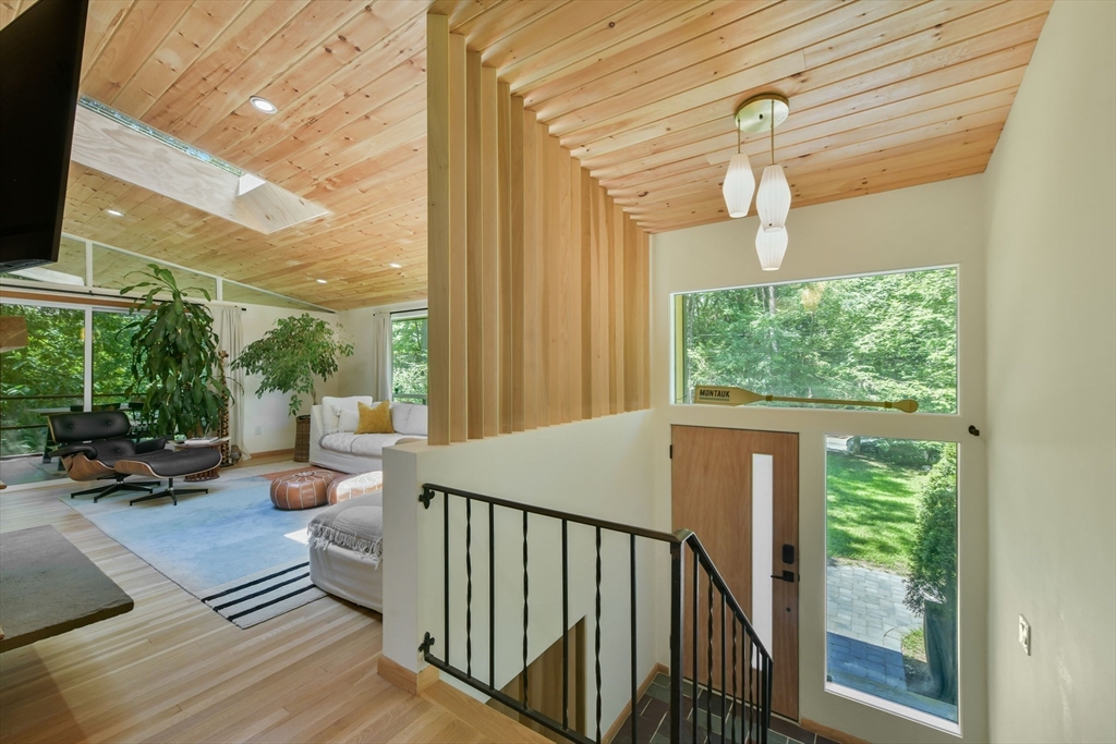 Nestled in Wayland's most coveted neighborhood, this meticulously reimagined midcentury modern home offers a unique living experience with clean lines and abundant natural light. Spanning approximately 2,000 sq ft., this 3-bedroom, 2.5-bathroom residence perfectly blends modern sophistication with midcentury charm. The heart of this home is an open-concept living space, anchored by a stylish, functional kitchen designed to seamlessly integrate with living and dining areas. Soaring ceilings with exposed beams and expansive skylights create a bright and airy ambiance, inviting relaxation and connection. Step outside to an expansive yard that offers warmth, charm, and effortless style. Enjoy direct access to trails behind the yard, perfect for leisurely strolls or embracing nature. Embrace the tranquility of a top-rated school district and a welcoming community atmosphere. This exceptional residence is more than just a house, it's a lifestyle offering comfort without sacrificing modernity