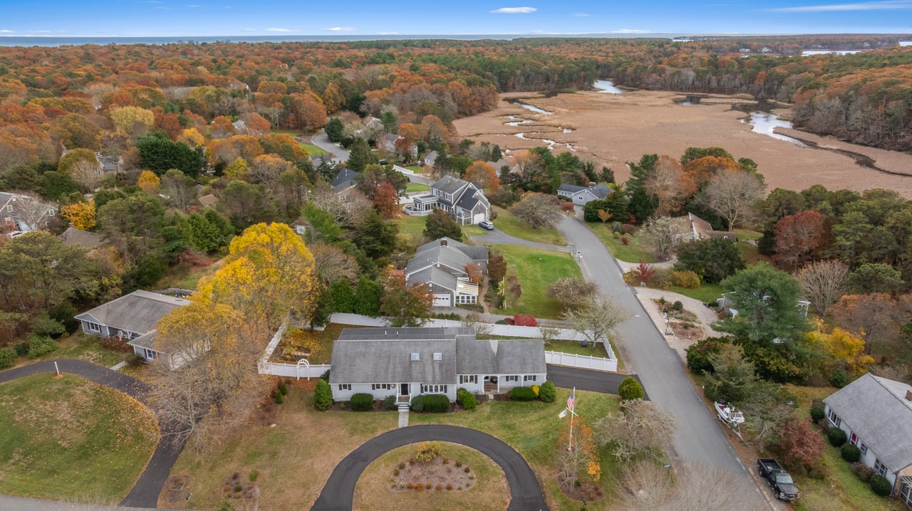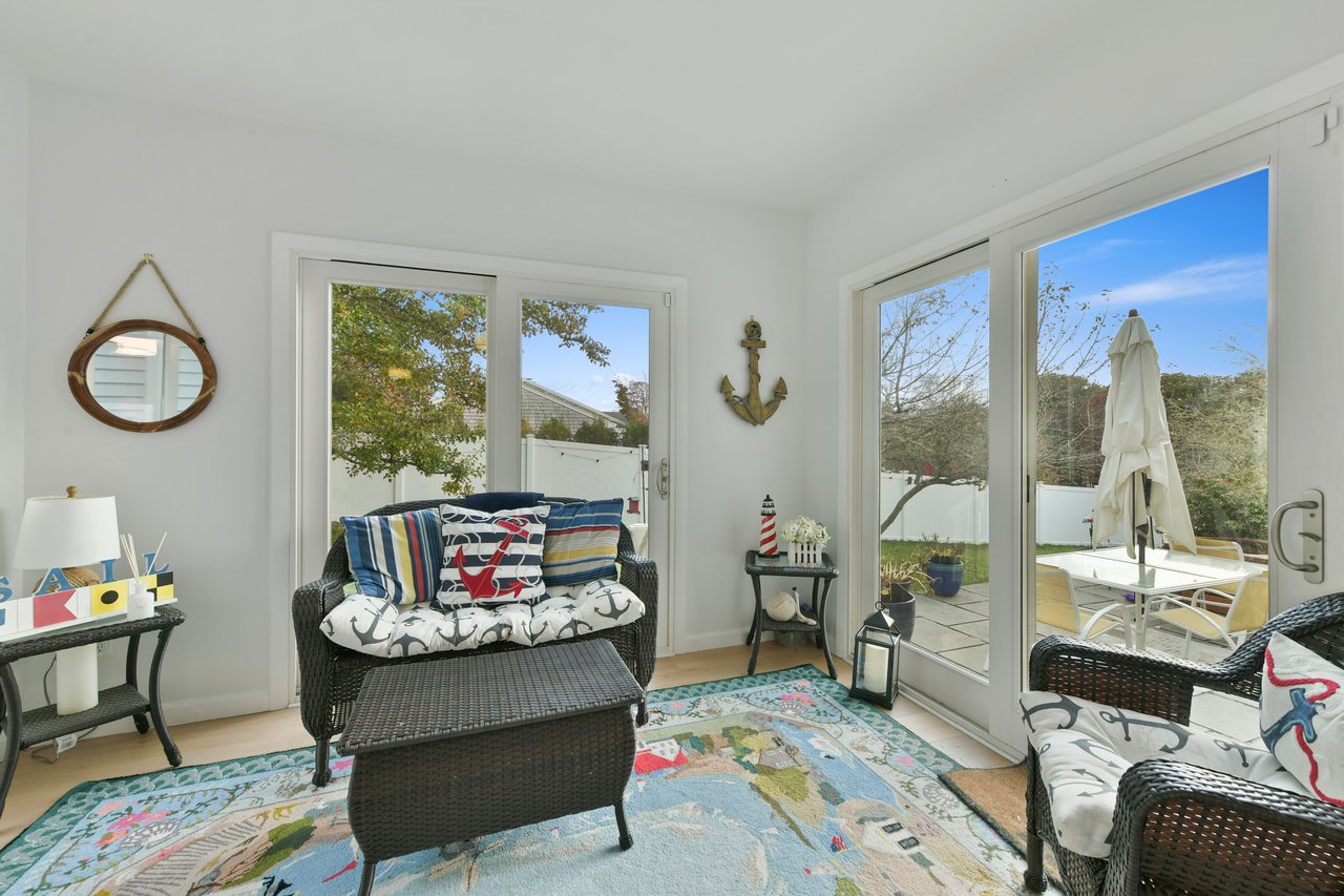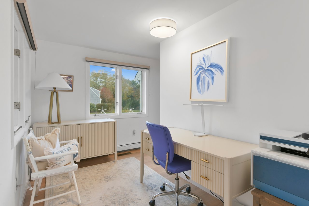 Set on a peaceful cul-de-sac in Cotuit, this charming Cape-style residence blends comfort, style, and flexibility across modern interiors. Gracious curb appeal welcomes guests, while a thoughtful layout opens seamlessly to a well-appointed living room filled with natural light that pours through glass doors leading to a three-season sunroom. At the heart of the home, a sleek eat-in kitchen with stainless steel appliances overlooks the lush backyard. An adjacent office connects to the formal dining room, ideal for entertaining, with peekaboo pond views. One en suite bedroom, two additional guest bedrooms, and a full bathroom complete the main level.