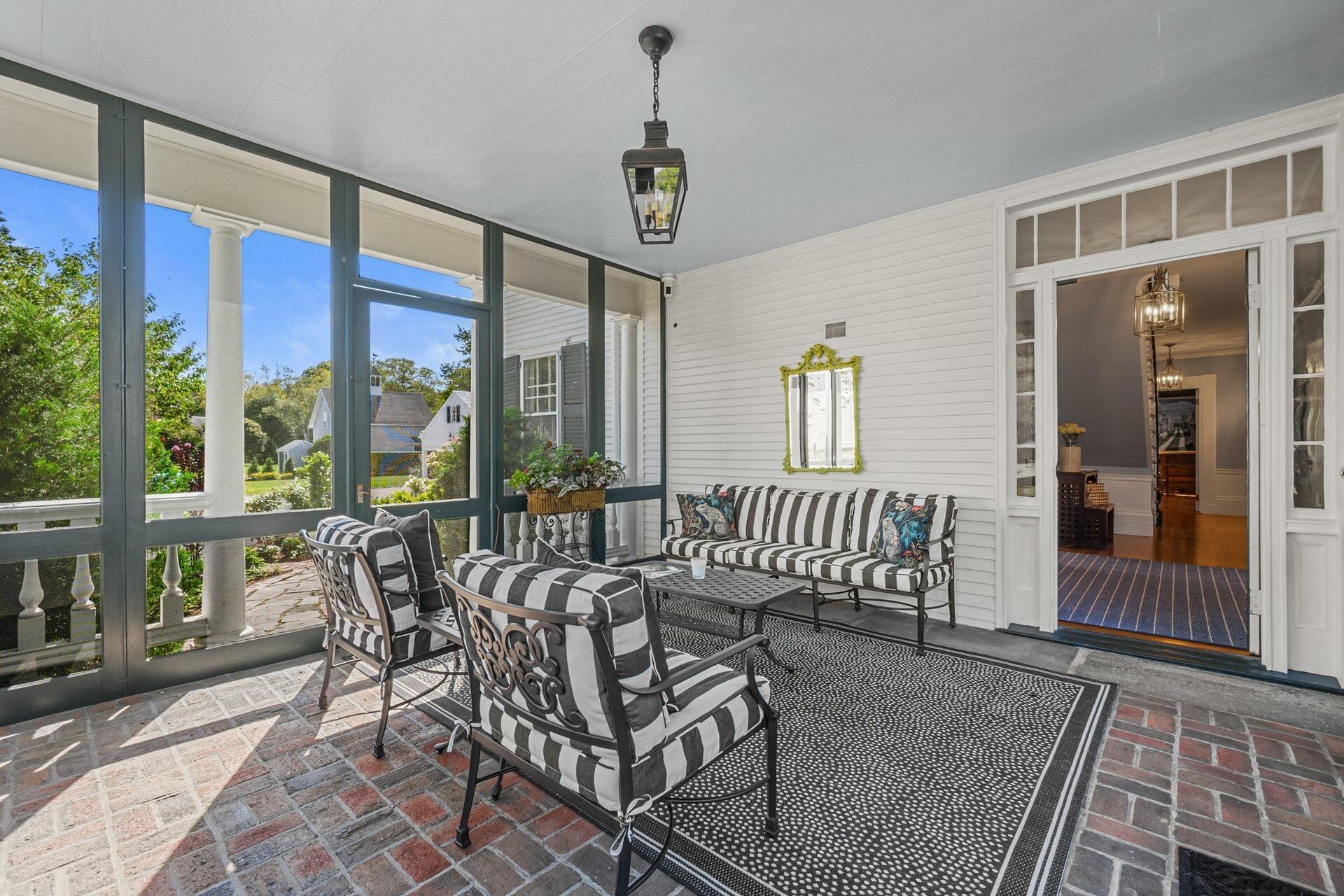 Set in the heart of Falmouth Village, this iconic Greek Revival offers a rare blend of timeless charm and modern comfort overlooking the Village Green. Surrounded by manicured gardens, the meticulously renovated home boasts preserved architectural details and thoughtful updates across three levels. A chef's kitchen with top-of-the-line appliances and a breakfast nook flows seamlessly into sun-splashed living spaces, including a formal dining room, great room, and library with intricate moldings, beamed ceilings, and hardwood floors. On the second floor, the primary suite includes a luxurious bathroom, dressing room, and custom closets, with two well-appointed bedrooms overlooking the Village Green completing the level. The top floor offers two additional bedrooms and a full bath, providing refined accommodations for family and friends. Outside, stone patios, landscaped grounds, and a three-bay garage complete this gracious setting, just steps from boutique shops, restaurants, and everything the village has to offer.
